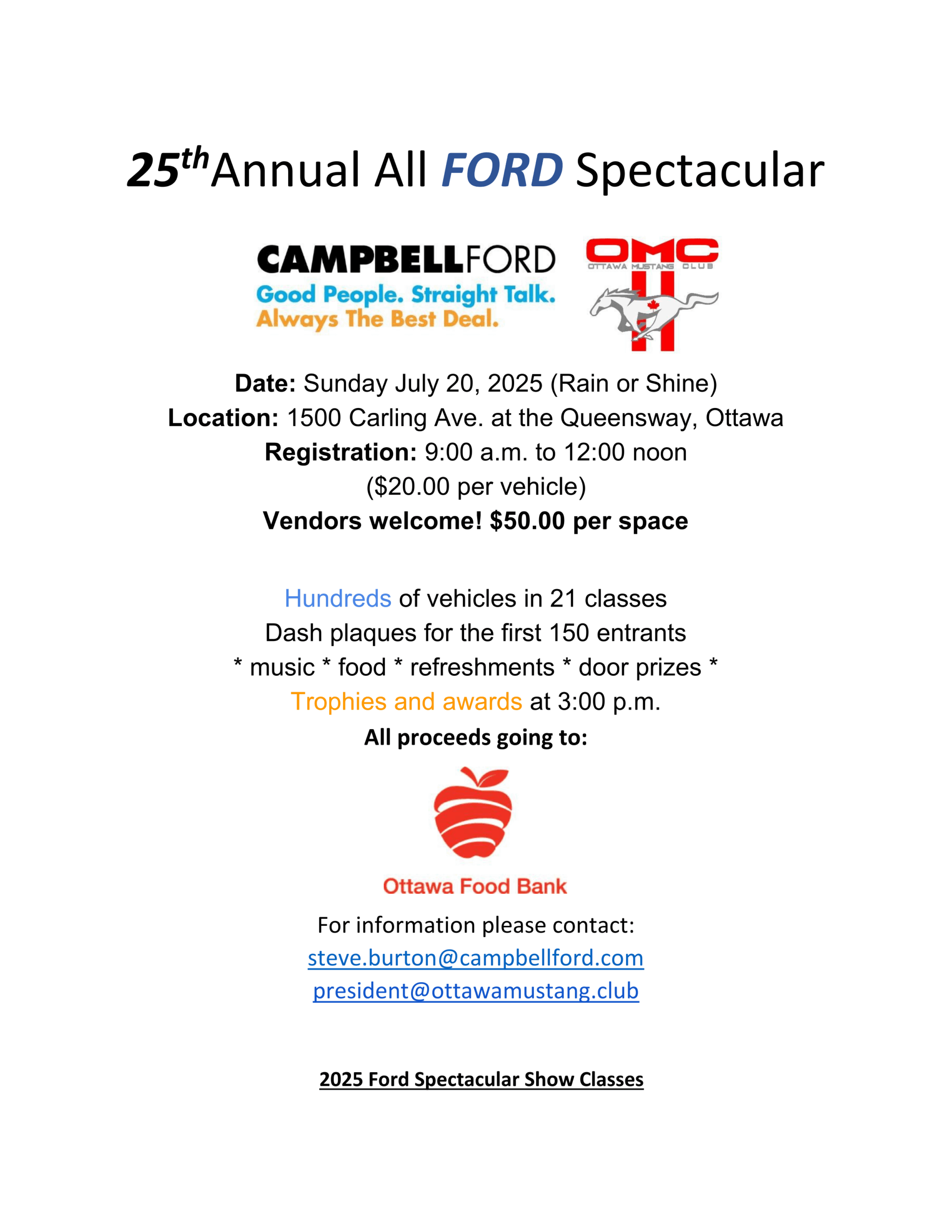 Ottawa Mustang Club, in collaboration with Campbell Ford present the 25th Annual All FORD Spectacular car show, in support of the Ottawa Food Bank.